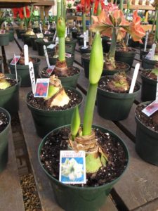 Here are more amaryllis growing at Rountree Nursery and Supply in Charlotte NC, where I worked for a few years. Large bulbs have more flower buds, safely tucked inside. So, if you keep the plants after they bloom, give them lots of sun, fertilize regularly, and keep the soil damp but not wet. As the leaves photosynthesize, carbohydrates are deposited into the bulb, bulking it up for the next bloom cycle.